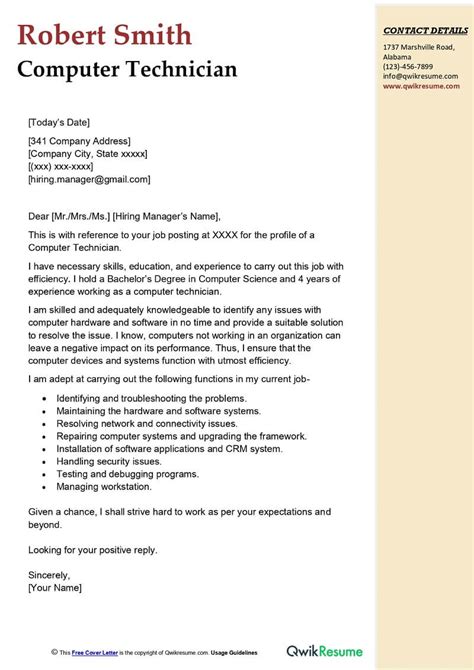 These examples will provide you with valuable insights and inspiration as you craft your own impactful cover letter. Use these computer technician samples as a guideline, or visit our extensive library of customizable free cover letter template. Craft an impressive computer technician cover letter with our.
