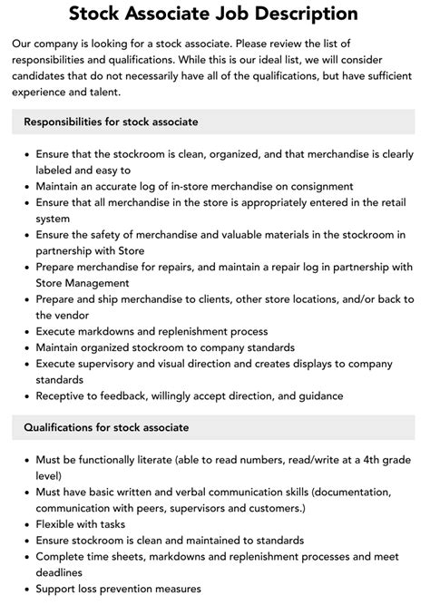 Stock Associate Job Description - Learn what a stock associate does, how to become one, and what skills and qualifications are required. Learn what a stock associate does, what skills and qualifications are required, and how much they earn. This includes receiving and processing. Learn about the key requirements, duties, responsibilities, and skills that should be in a stock associate job description. Find a template.